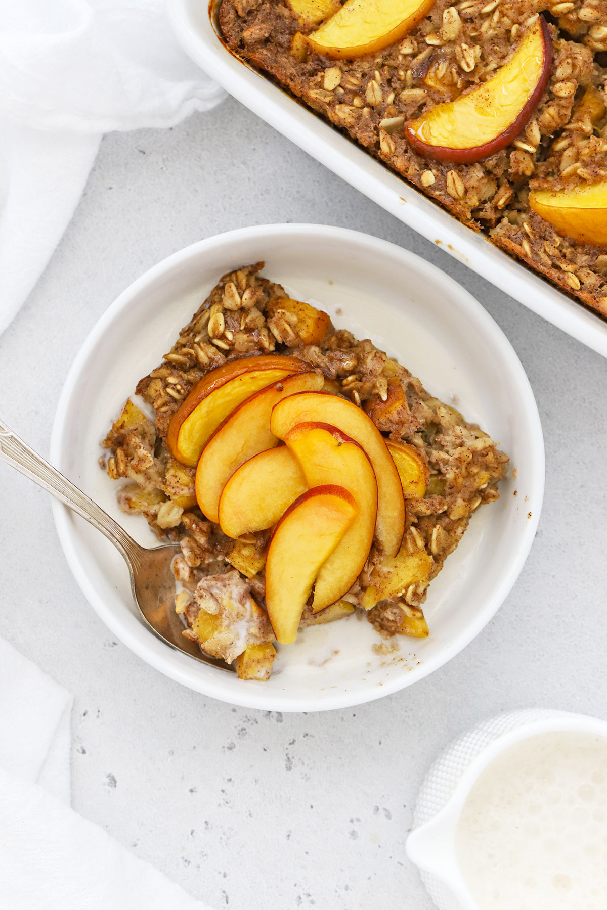 Experience a delightful breakfast with our almond & peach baked oatmeal, where the sweetness of ripe peaches meets the warmth of oven-baked oats for a comforting and wholesome start to your day.