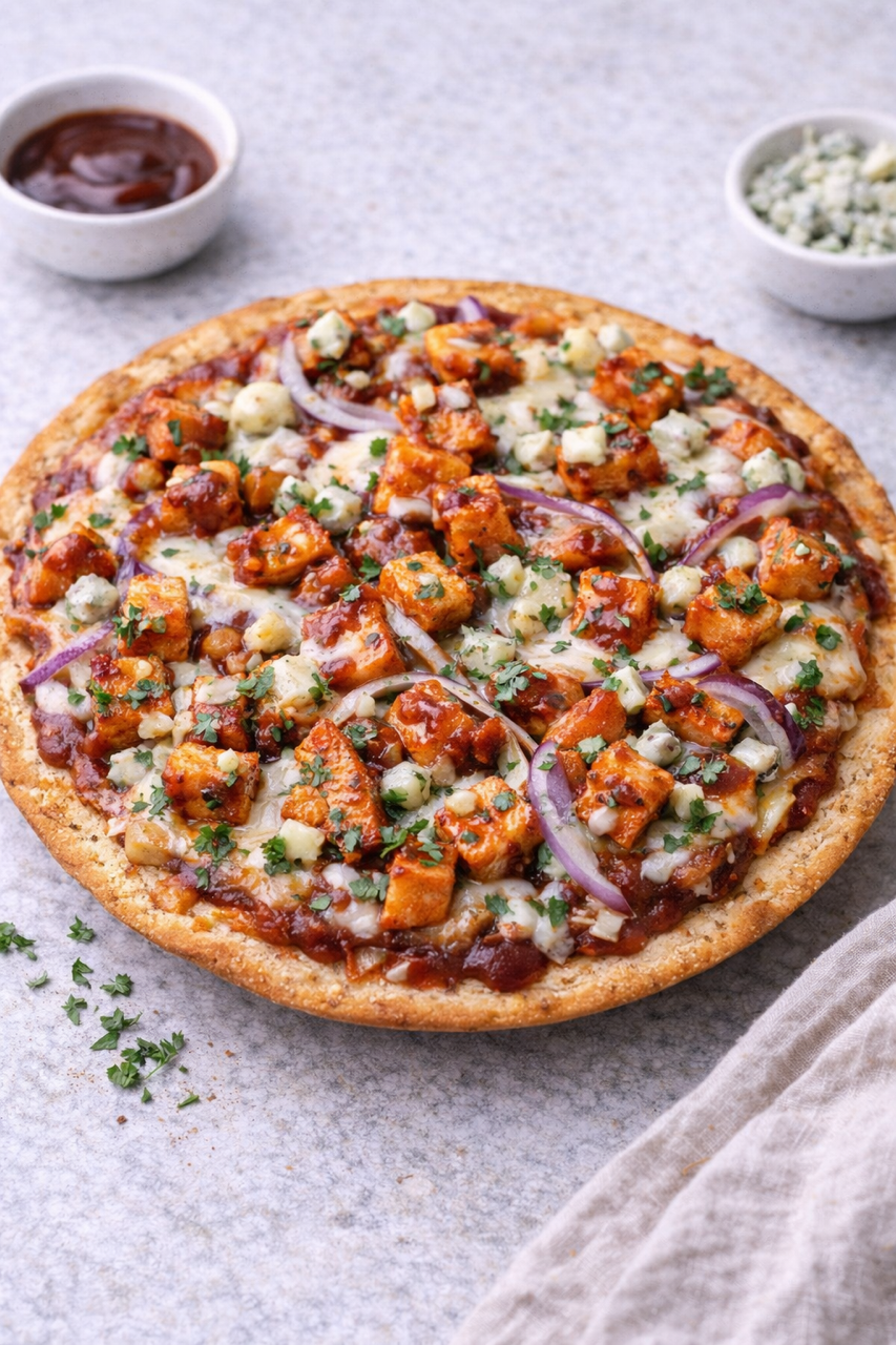 High fiber pita bread topped with bbq sauce, light mozzarella, red onion, bleu cheese, & chicken