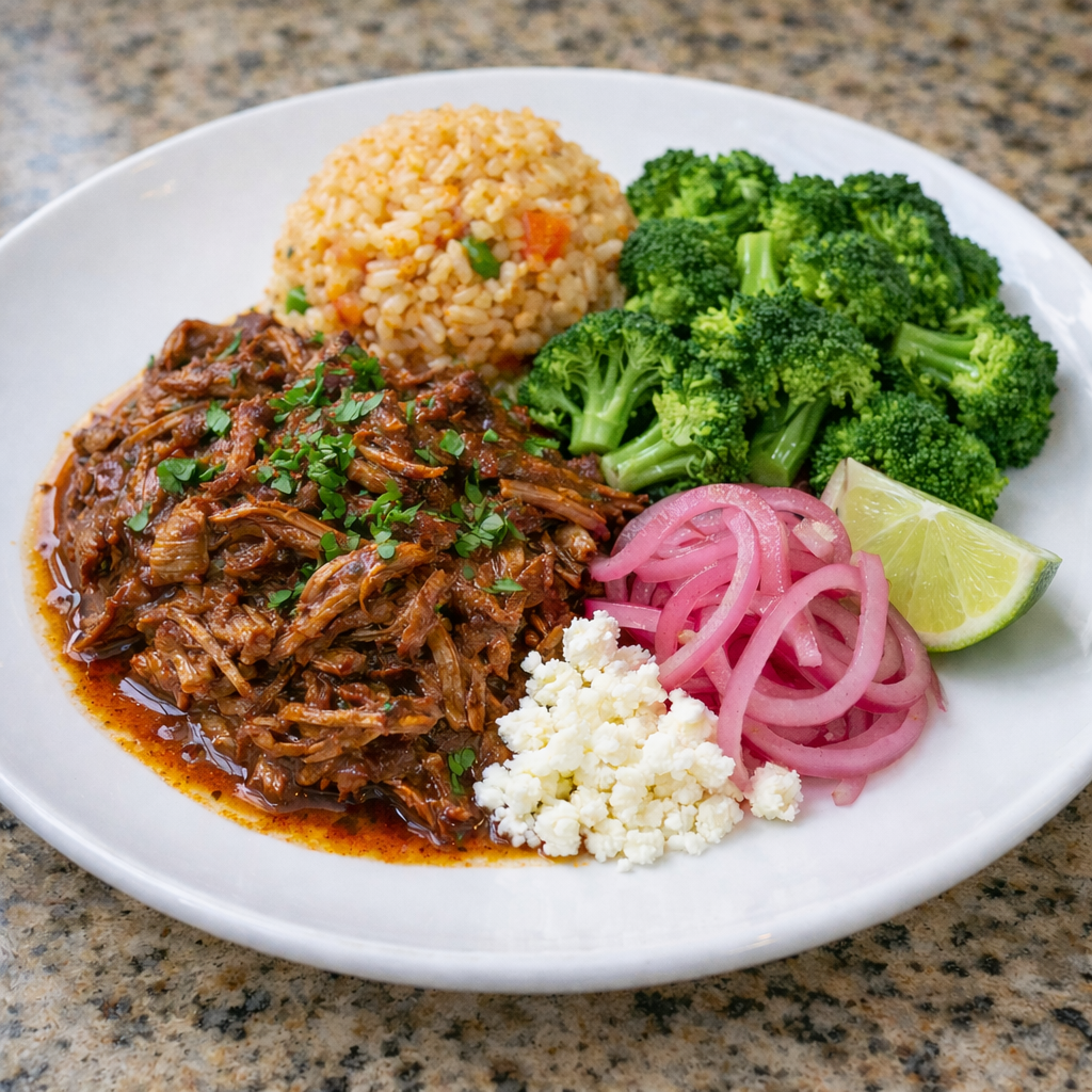 Slow cooked Birria beef, mexican rise, roasted broccoli, pickled red onions, cotija cheese and lime wedge.