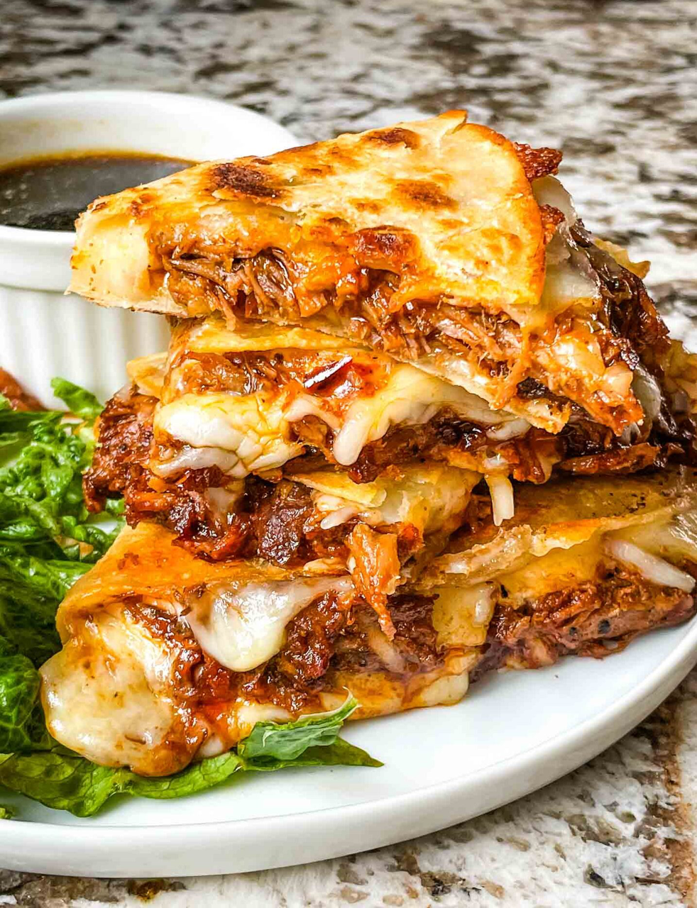 Mouthwatering Birria quesadilla featuring tender, flavorful shredded beef, gooey melted cheese, and a rich consommé dipping sauce, paired with veggies for a delightful fusion of Mexican flavors.