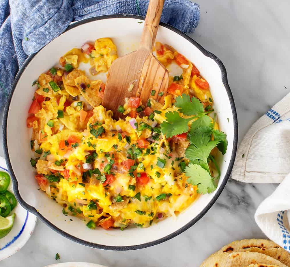 Scrambled eggs with tomatoes, red onions, Monterey jack cheese, crumbled corn tortilla chips and cilantro served with a side of tortillas.