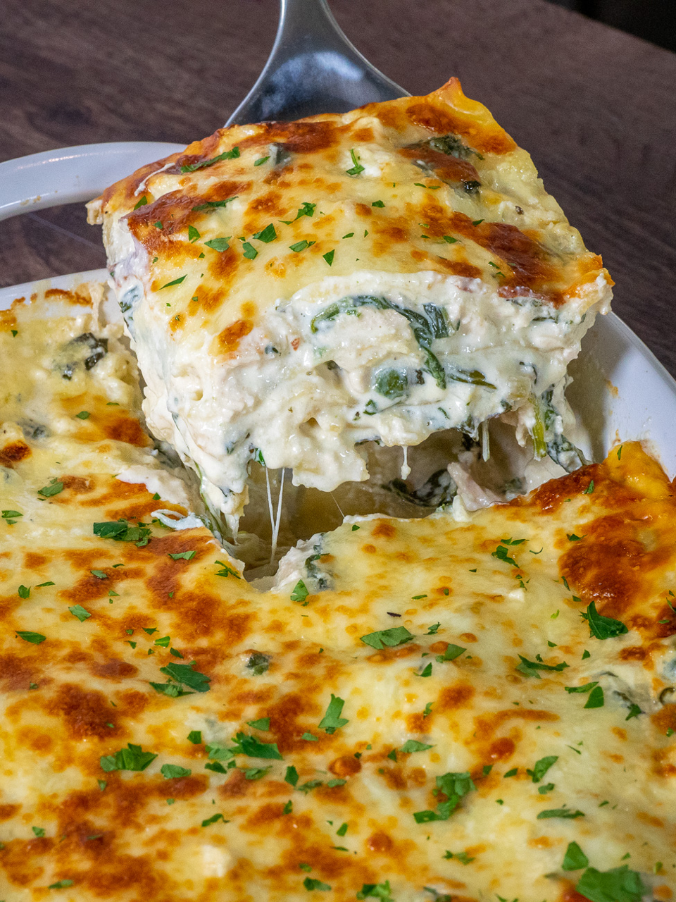 Indulge in our decadent portioned chicken Alfredo lasagna, layered with tender chicken, spinach, creamy Alfredo sauce, and melted cheese, for a satisfying Italian-inspired delight.