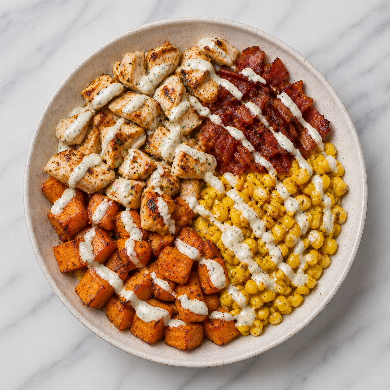 Chicken, sweet potato, corn, turkey bacon, ranch drizzle