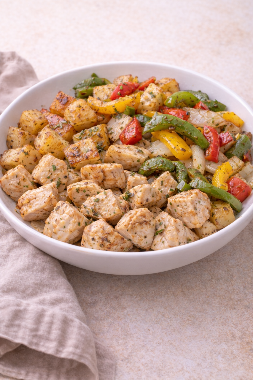 Sautéed chicken bites paired with diced breakfast potatoes and sautéed peppers and onions.