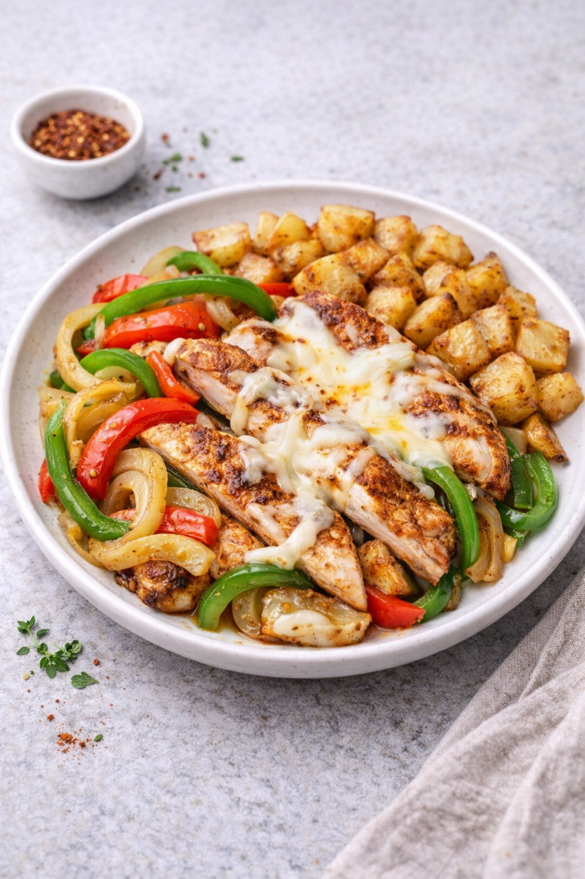 Chicken & potatoe bowl, topped w/ sauteed onions+peppers and cheddar cheese