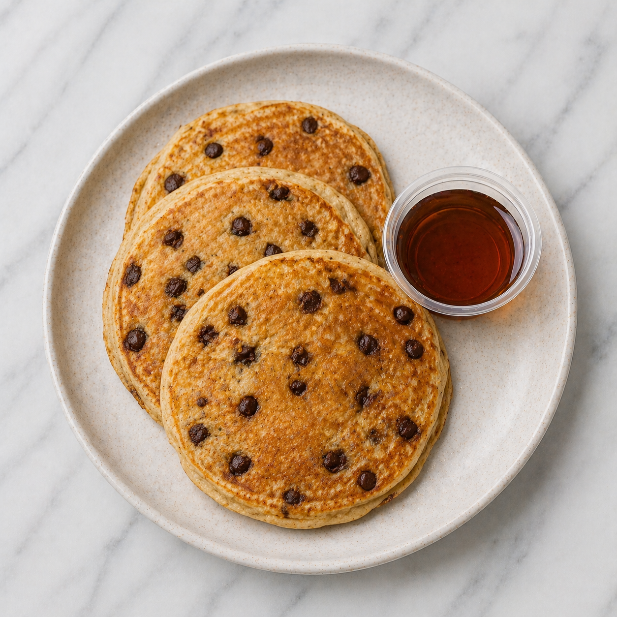 Protein pancakes w/ chocolate chips served w/ light syrup