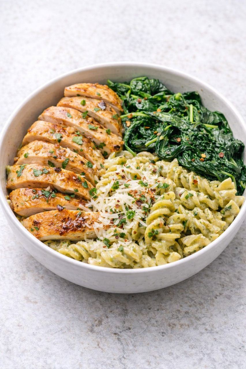 Protein-pasta served with chicken in a creamy spinach & pesto cream