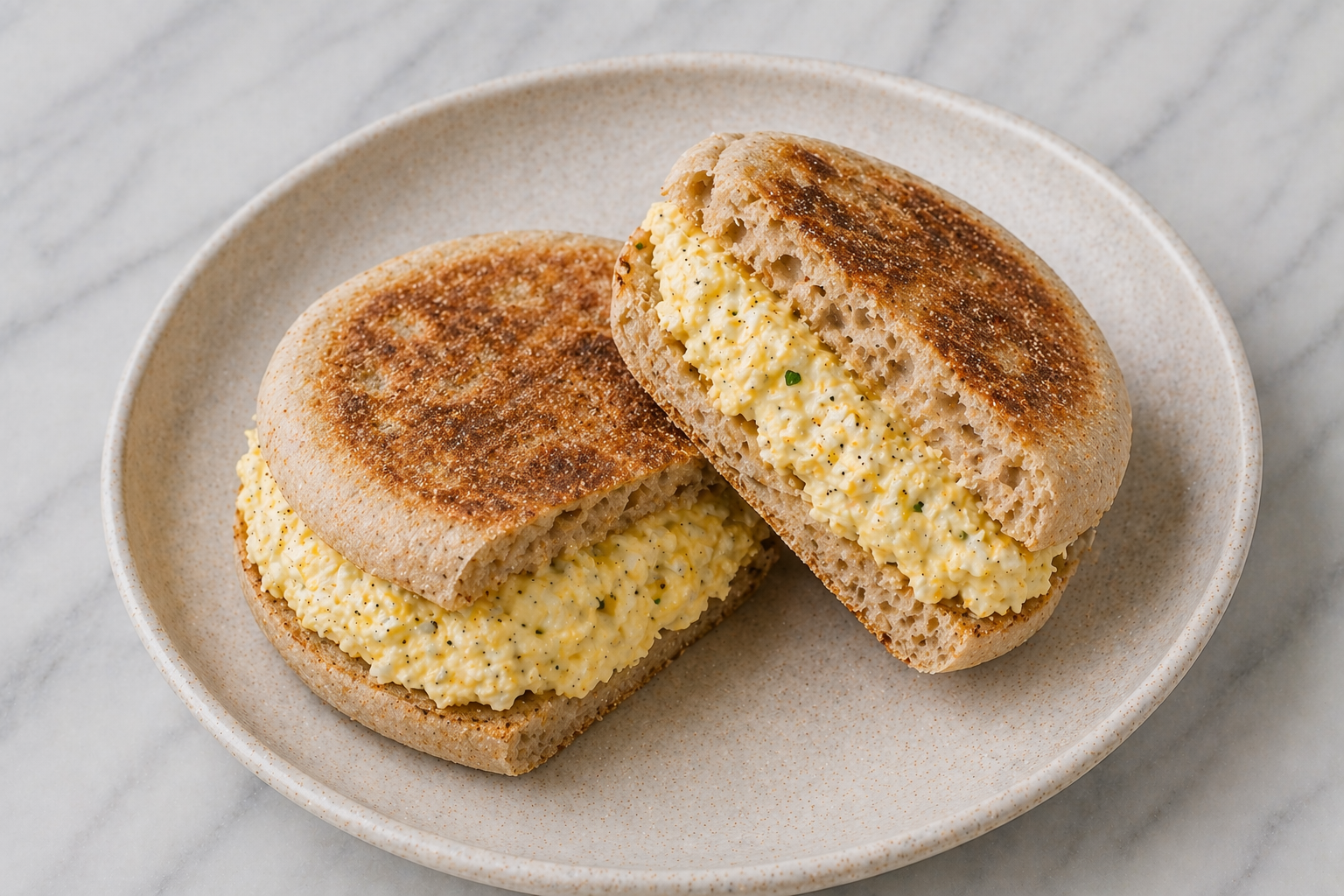 Egg salad with cottage cheese mayo on a whole wheat English muffin