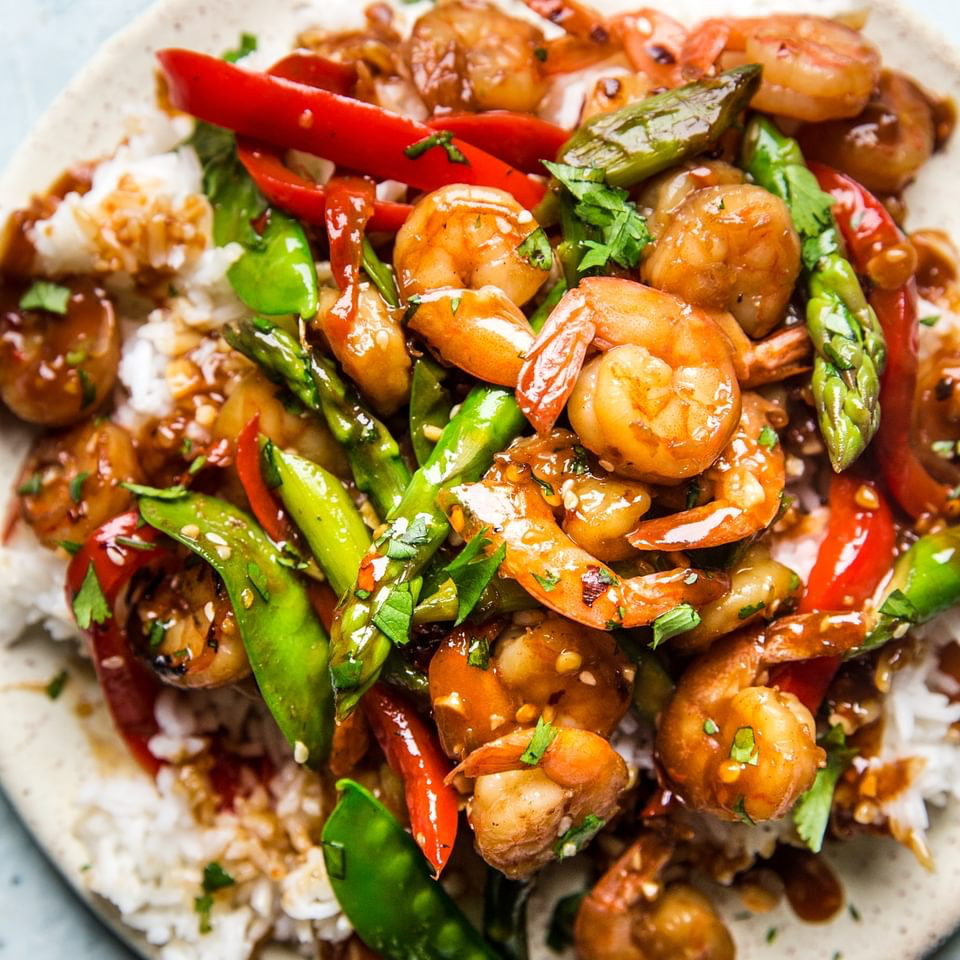 Succulent shrimp and crisp veggies wok-tossed in garlic sauce, served with fluffy cauliflower rice.