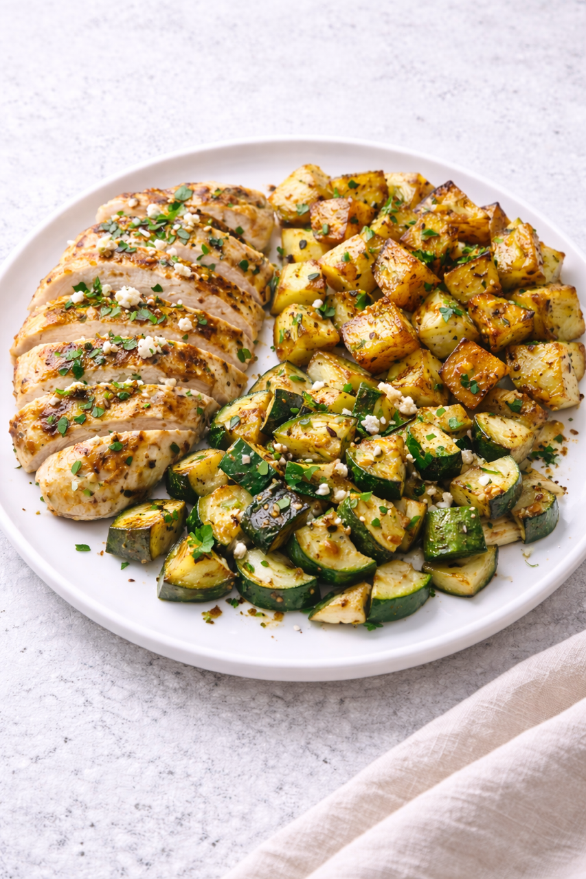 Greek chicken served with sautéed zucchini bites and roasted potatoes.