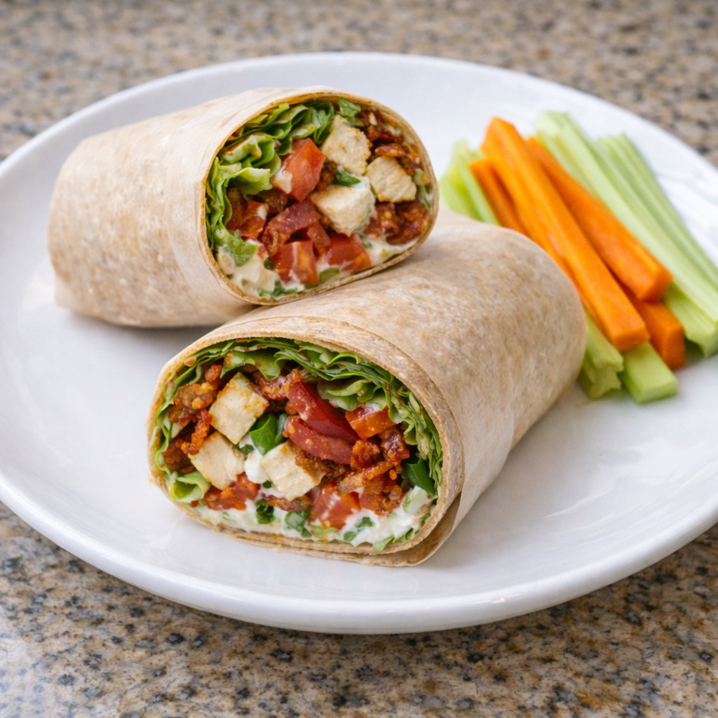 Grilled chicken, turkey bacon, lettuce and tomato wrapped in a fluffy tortilla. Served with a side of carrots and cellety sticks and high protein ranch.
