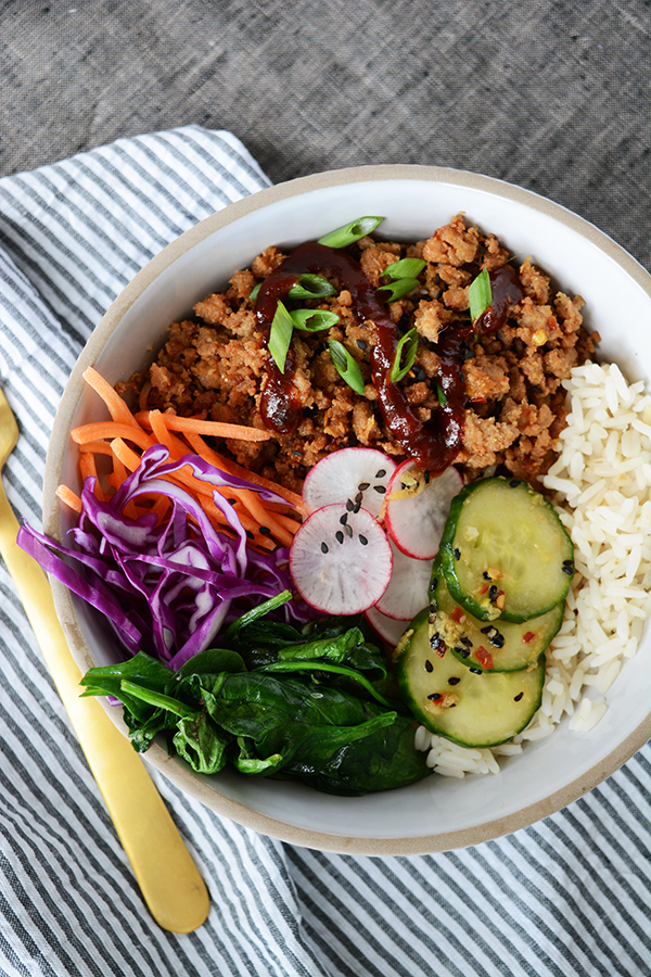Ground turkey teriyaki rice bowl, medley of carrots, radishes, spinach, and cucumber.