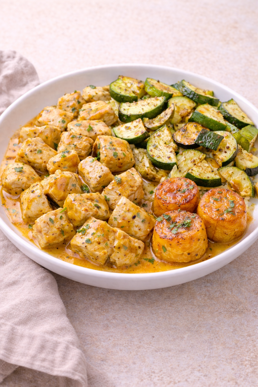 Honey Mustard chicken paired with sautéed zucchini bites and fondant sweet potato.