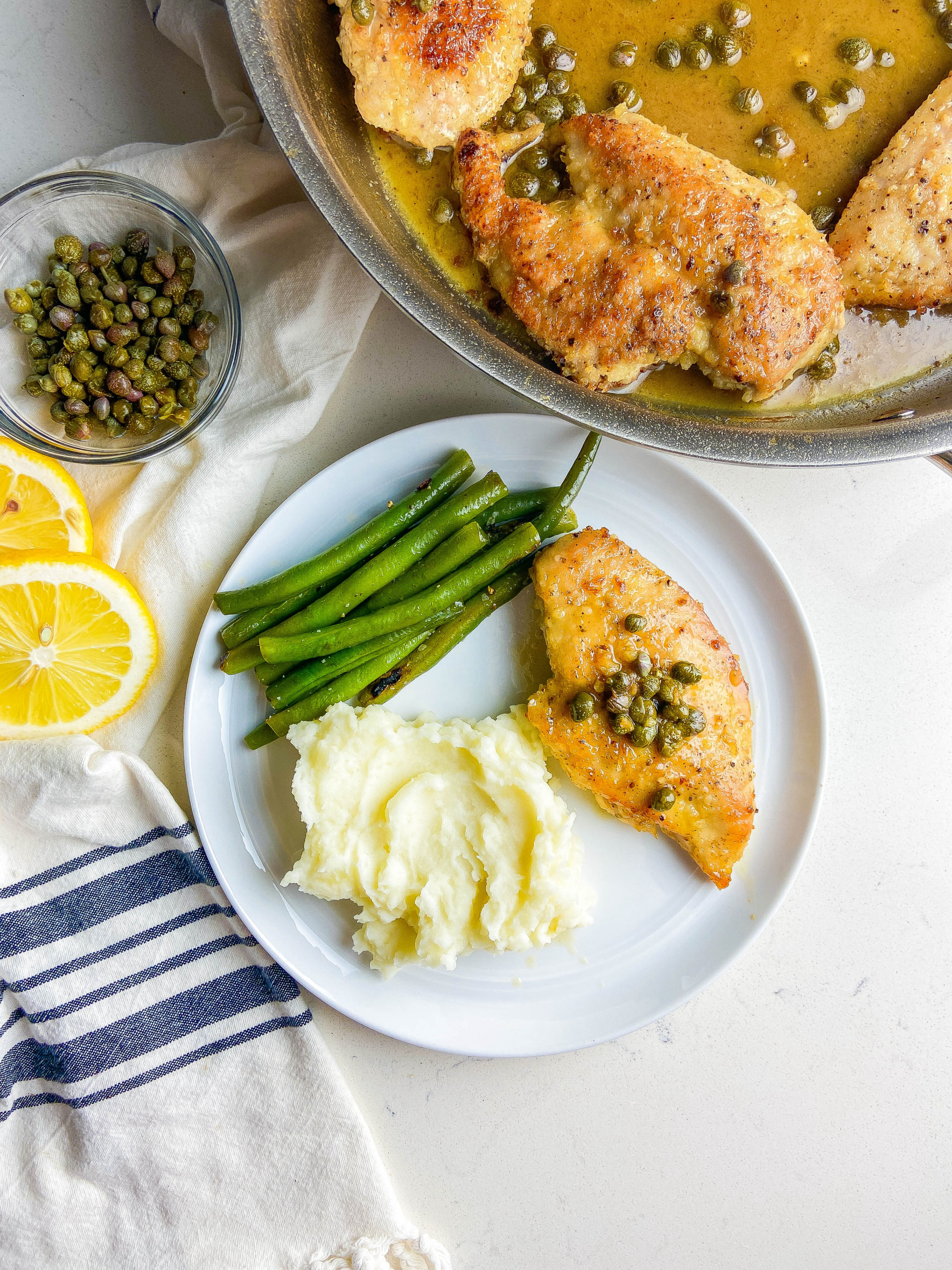 Tender chicken topped with a lemon caper sauce paired with mashed potatoes and crisp green beans.