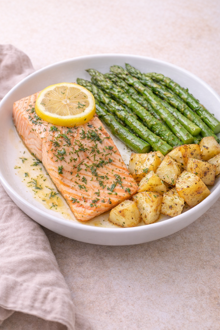 Lemon Dill Salmon paired with roasted asparagus and roasted potato bites.