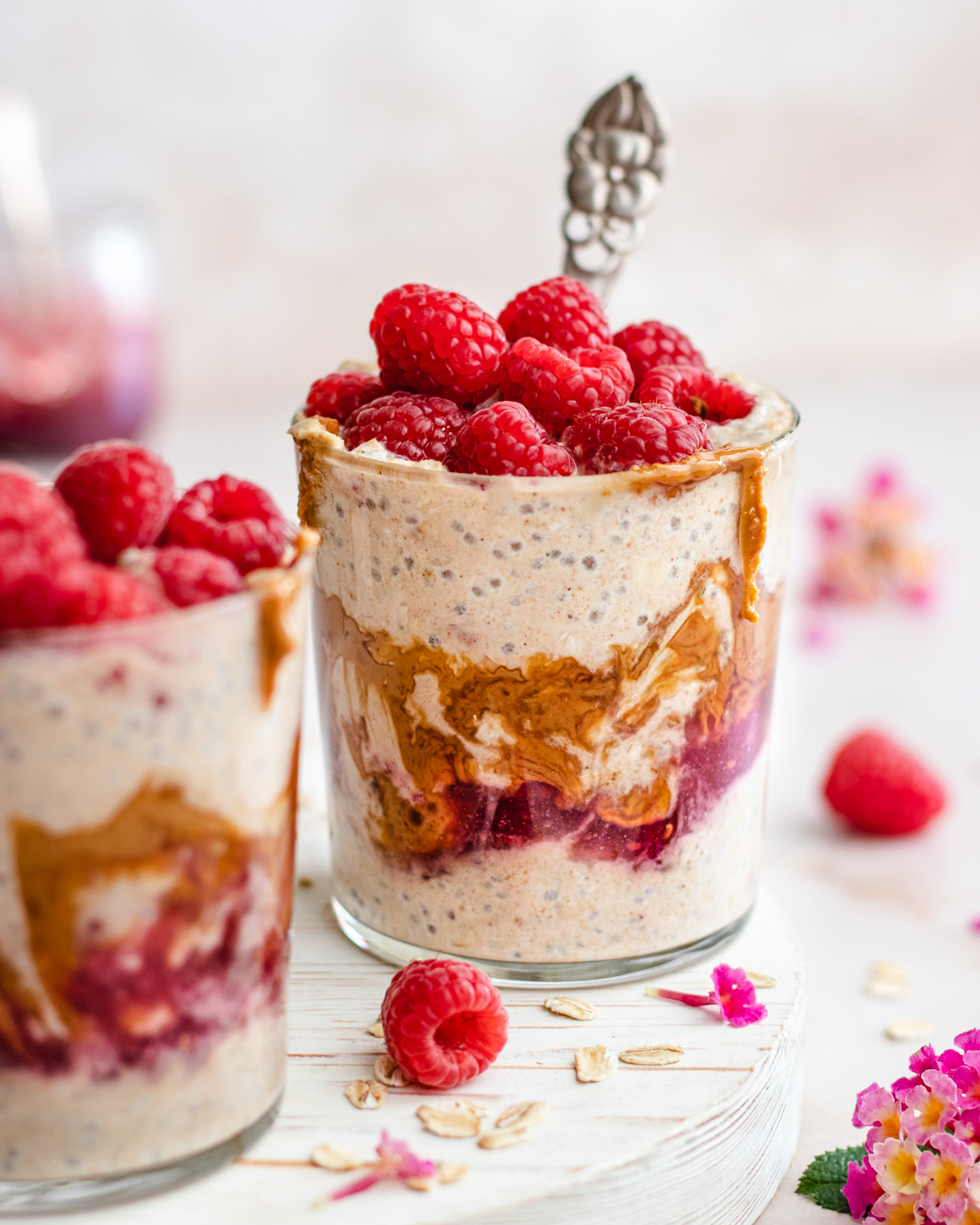 Creamy peanut butter and tangy strawberry jelly layered between creamy oats and chia seeds pudding.