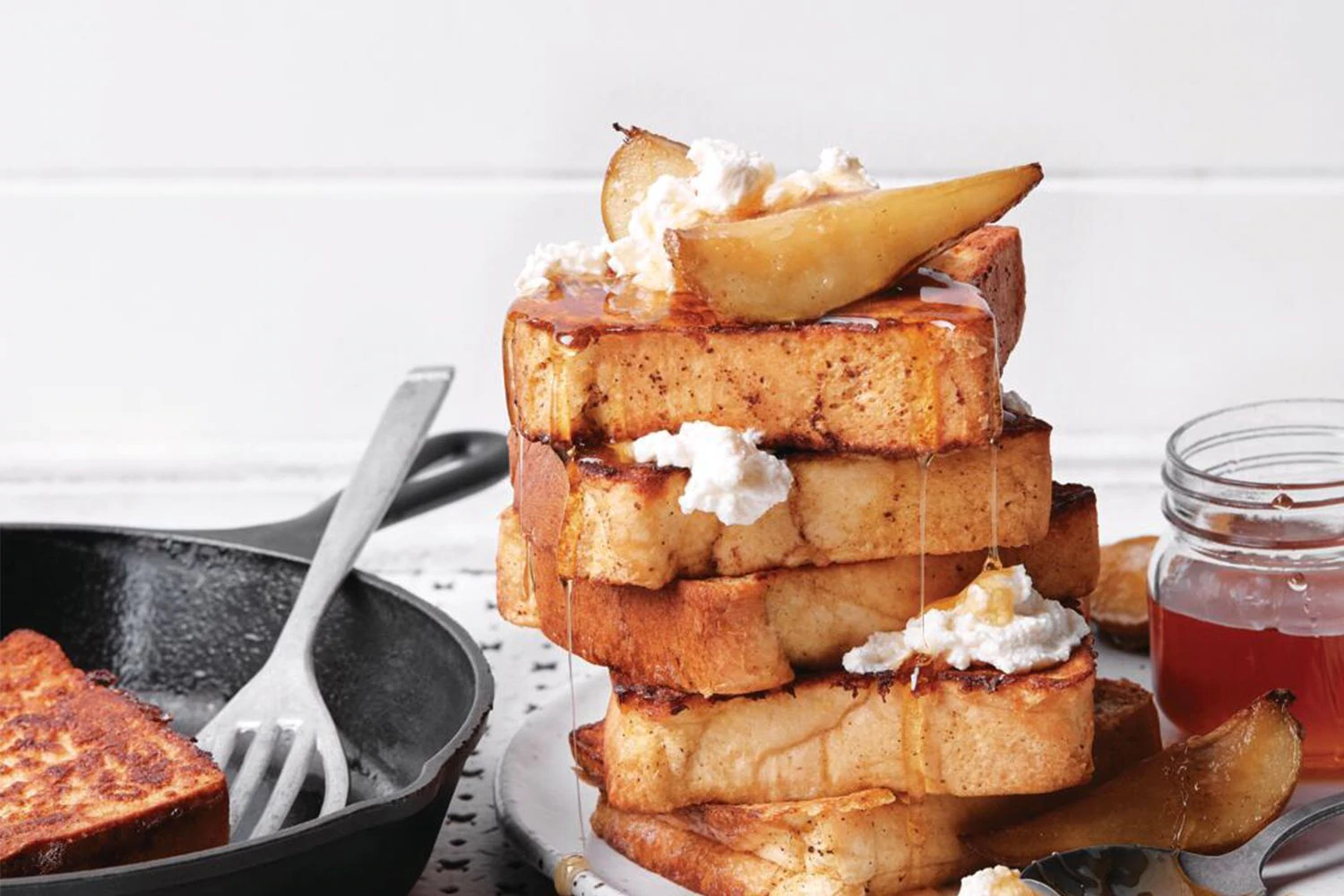 Fluffy protein infused French toast with a side of honey ricotta and caramelized pears.