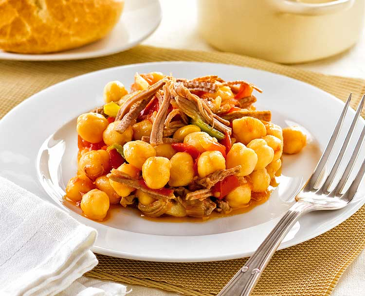 Shredded chicken, garbanzo beans, chorizo, and fresh veggies harmoniously stir-fried in fresh tomato sauce.