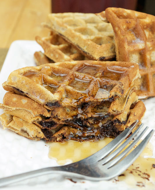 Protein choc-chip waffles served with a side of light syrup and turkey bacon.