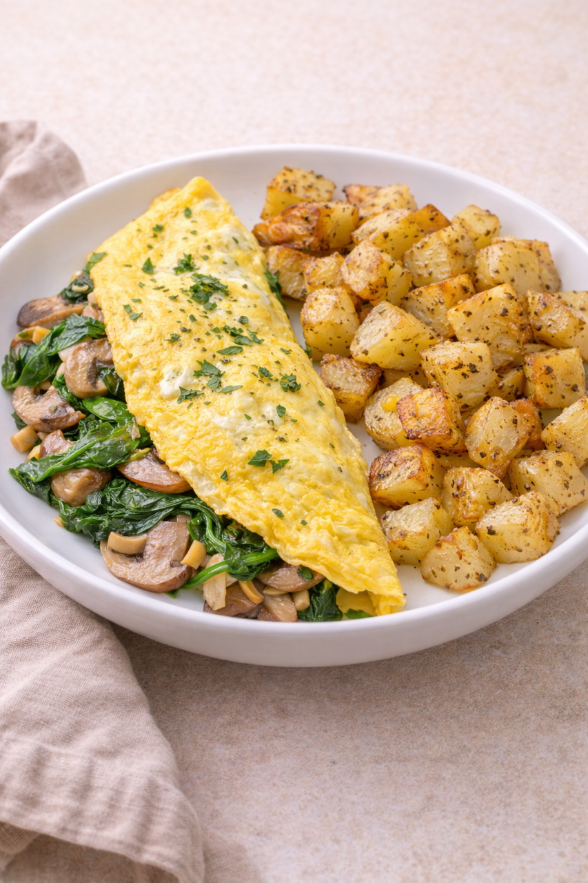 Indulge in our wholesome veggie omelette, perfectly paired with a side breakfast potatoes.