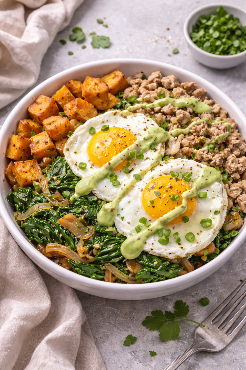Roasted sweet potato, spinach, caramelized onions, pan fried eggs and ground turkey with a side of avocado crema.