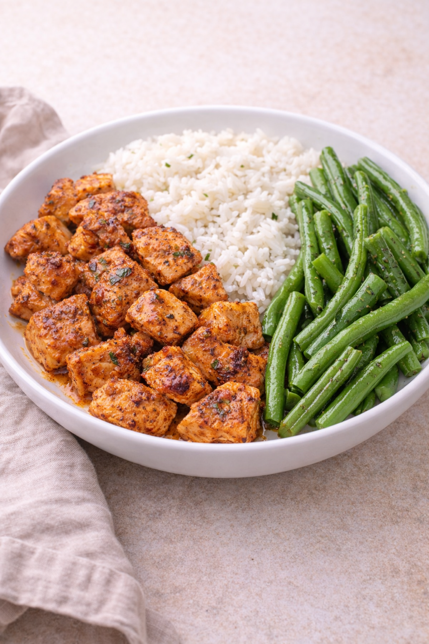 Smoky paprika chicken paired with green beans and fluffy jasmine rice.