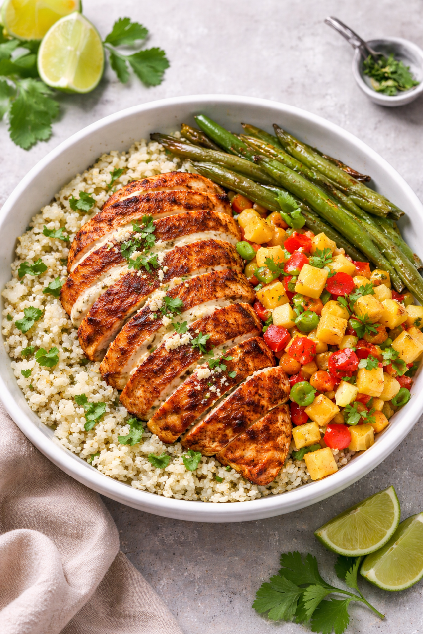 Grilled paprika chicken swerved with a charred pineapple salsa, roasted green beans and lime quinoa.