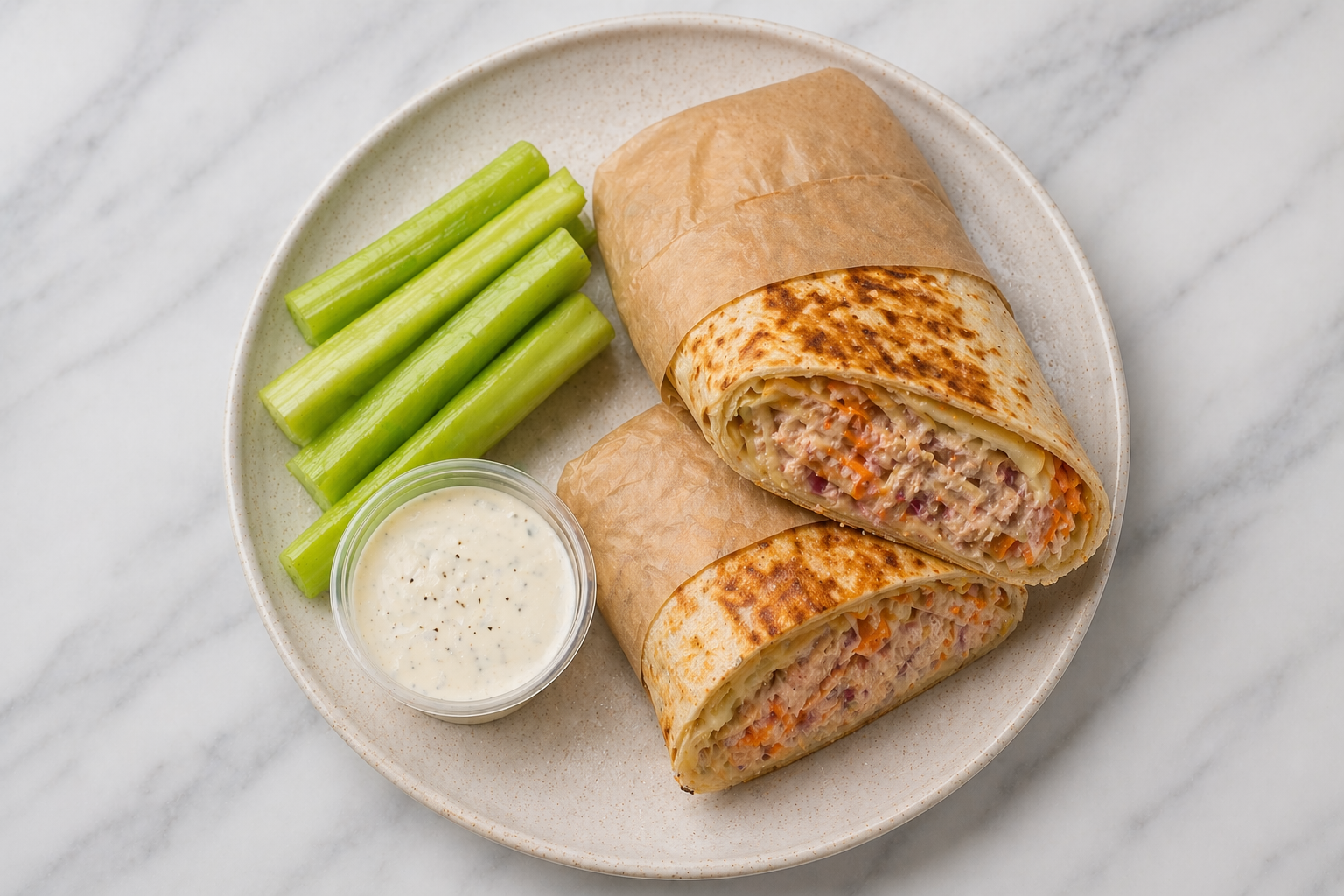 Tuna salad with light mayo, onions and carrots, light cheese, toasted wrap, side of celery sticks and ranch in a portioned cup