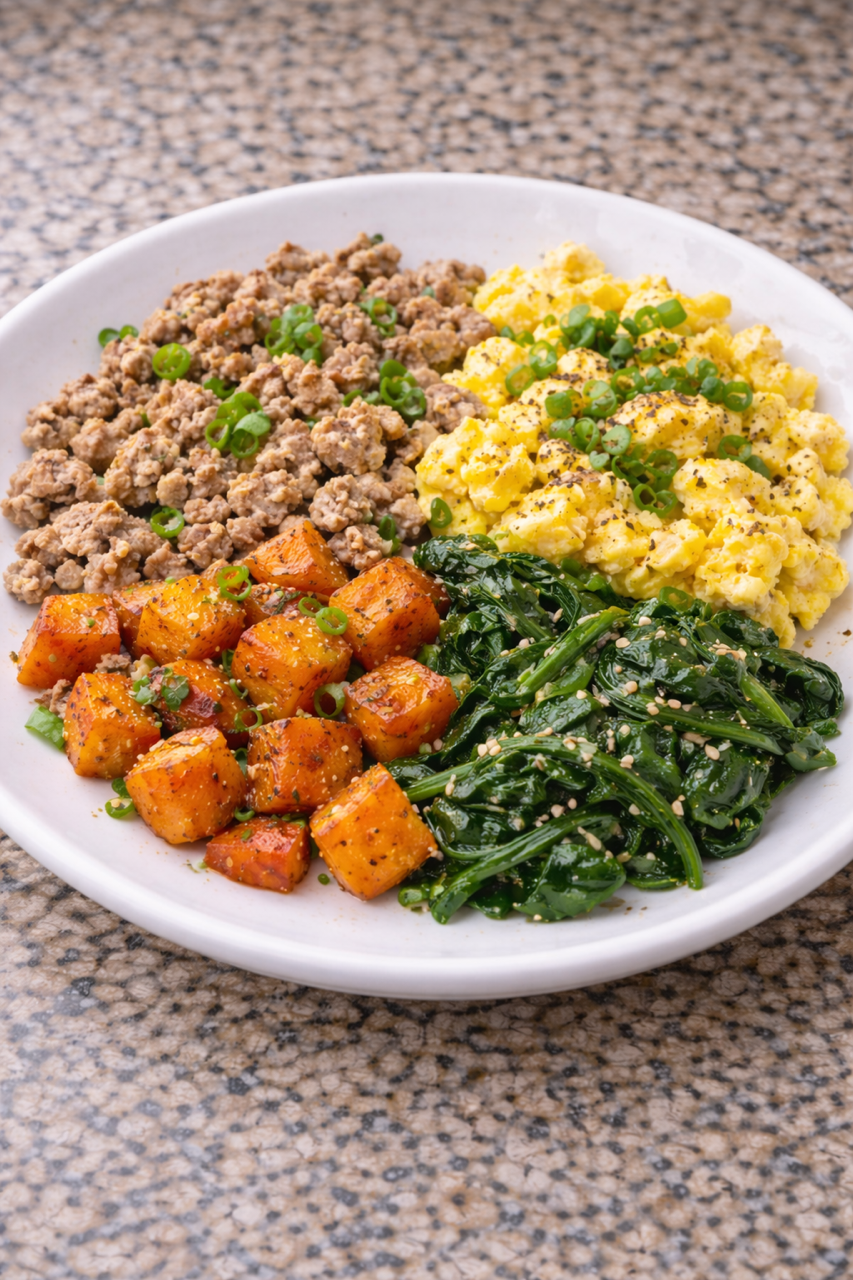 Breakfast skillet with ground turkey, scrambled eggs, roasted potato bites, and garlic spinach.