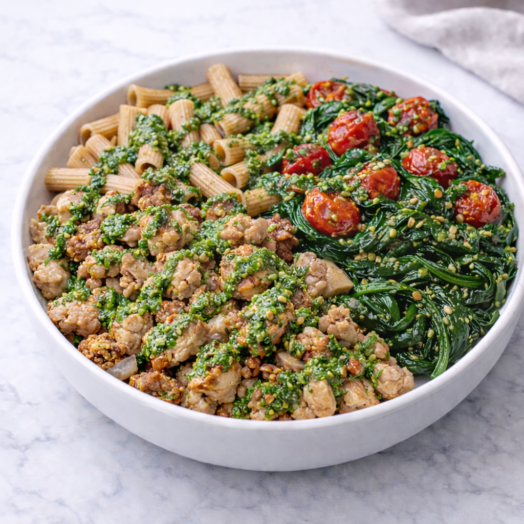 Garlic turkey, whole wheat pasta, roasted tomatoes, spinach, pesto drizzle.