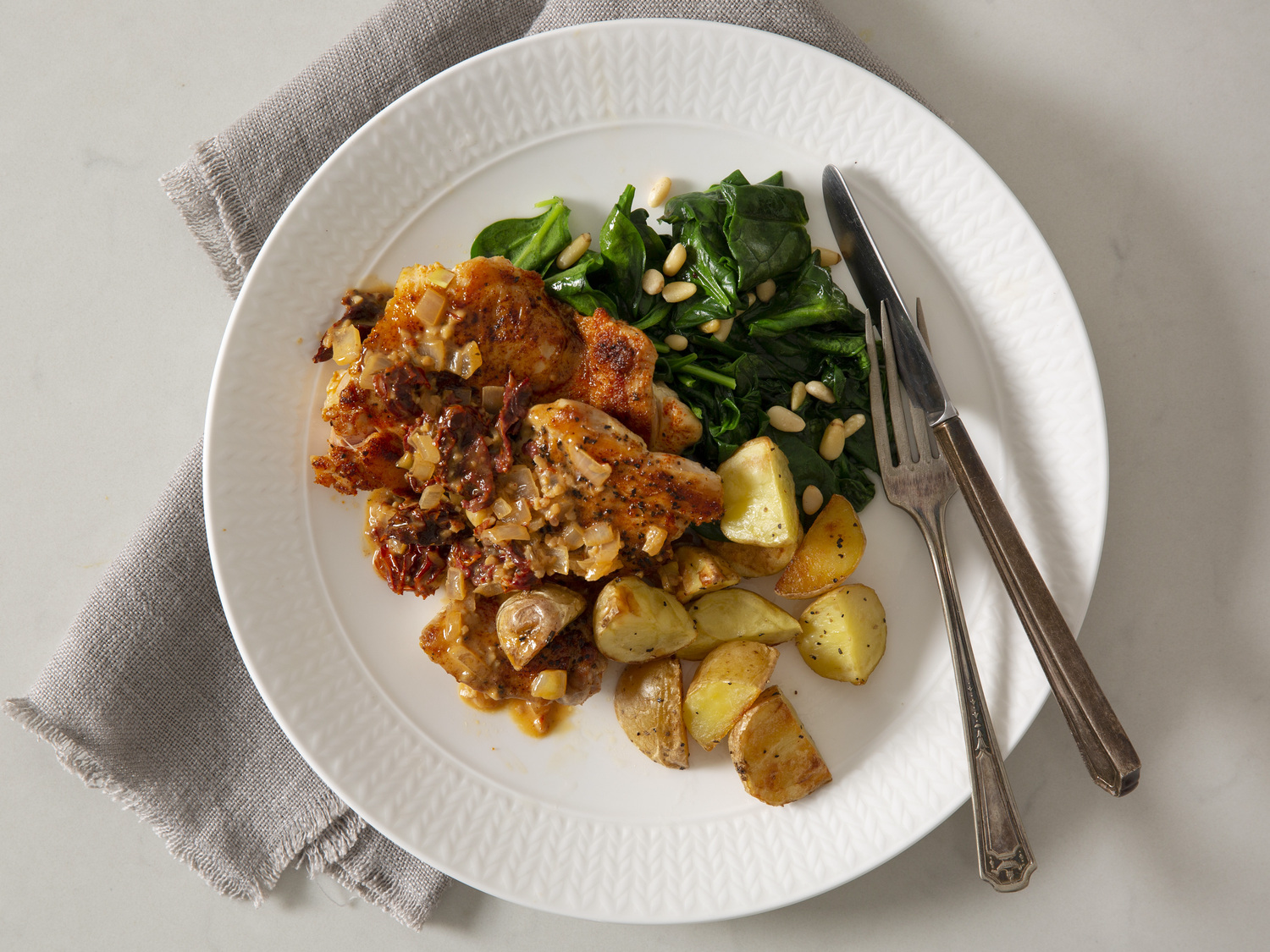 Tuscan chicken with sautéed spinach and baby potatoes